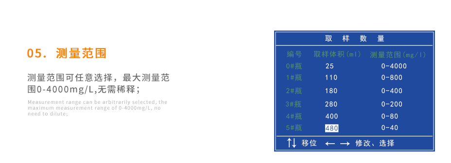 測量范圍可選擇,在水樣濃度低于4000mg/L時,無需稀釋;